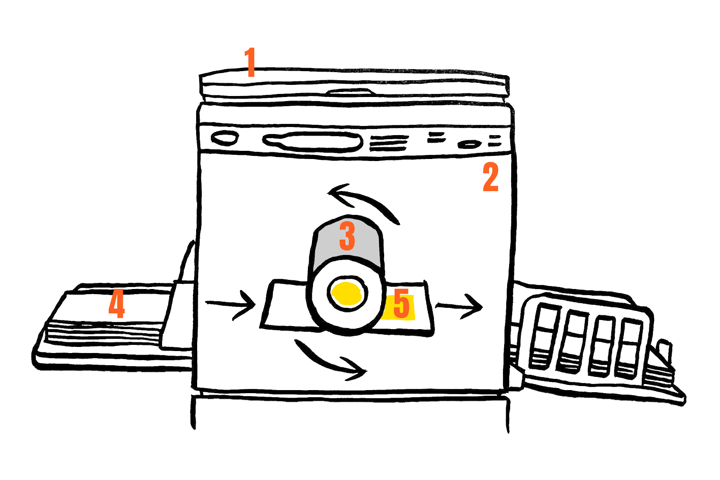 L’image, scannée (1) ou envoyée par ordinateur, est microperforée sur le master (2) et forme une sorte de pochoir qui vient se déposer autour du tambour (3).Le papier (4) passe sous le tambour dont la rotation permet l’encrage et, grâce au master, l’impression de l’image selon la couleur de l’encre choisie (5).